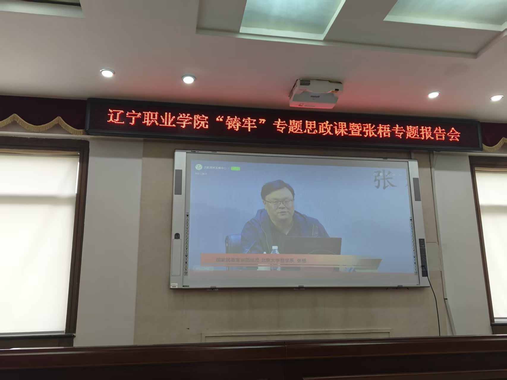此次专题思政课,刘诗宇老师在现场作专题教学,带领学生线上云参观辽宁省博物馆的“山海共融和合共生——辽宁省铸牢中华民族共同体意识主题展”。线上依托辽宁省教育厅邀请北京大学哲学系研究员张梧作专题报告,从中华文明看中华民族共同体,明确中华民族共同体是人心所向、大势所趋、历史必然。