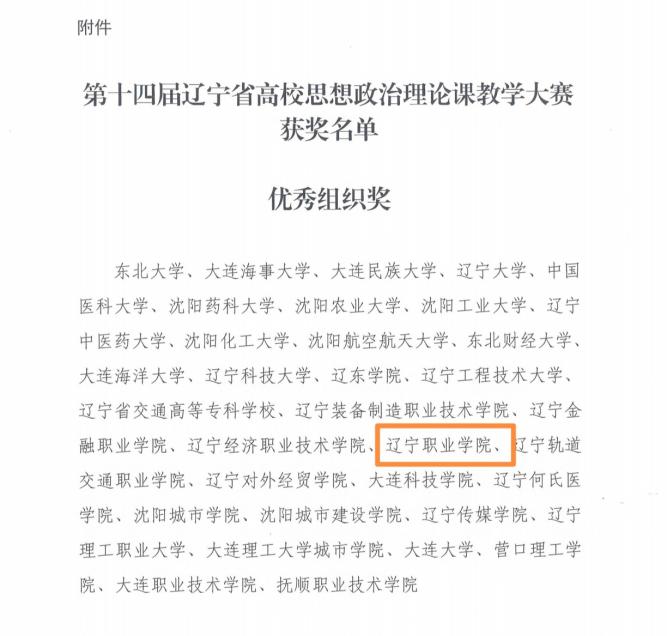 近日,中共辽宁省委教育工委、辽宁省教育厅主办的第十四届辽宁省高校思想政治理论课教学大赛圆满落幕。辽宁省高校思想政治理论课教学大赛是全省范围内级别最高、影响力最广的思政课教学专项赛事,旨在全面展示和交流各高校思政课教学改革的成果,提升思政课教师的教学水平与综合素质。本届大赛竞争激烈,汇聚了全省众多高校的优秀教师同台竞技。本届大赛吸引全省89所高校同台竞技,我校凭借出色的组织工作和扎实的育人成效,获得“优秀组织奖”。