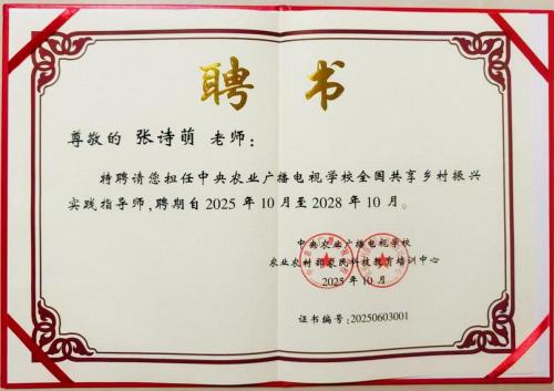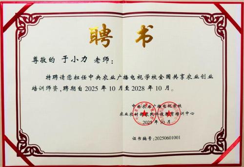 近日,中央农业广播电视学校、农业农村部农民科技教育培训中心正式签发聘书,我校于小力老师、张诗萌老师凭借深厚的专业积淀与丰富的实践经验,分别受聘为“全国共享农业创业培训师”“全国共享乡村振兴实践指导师”。